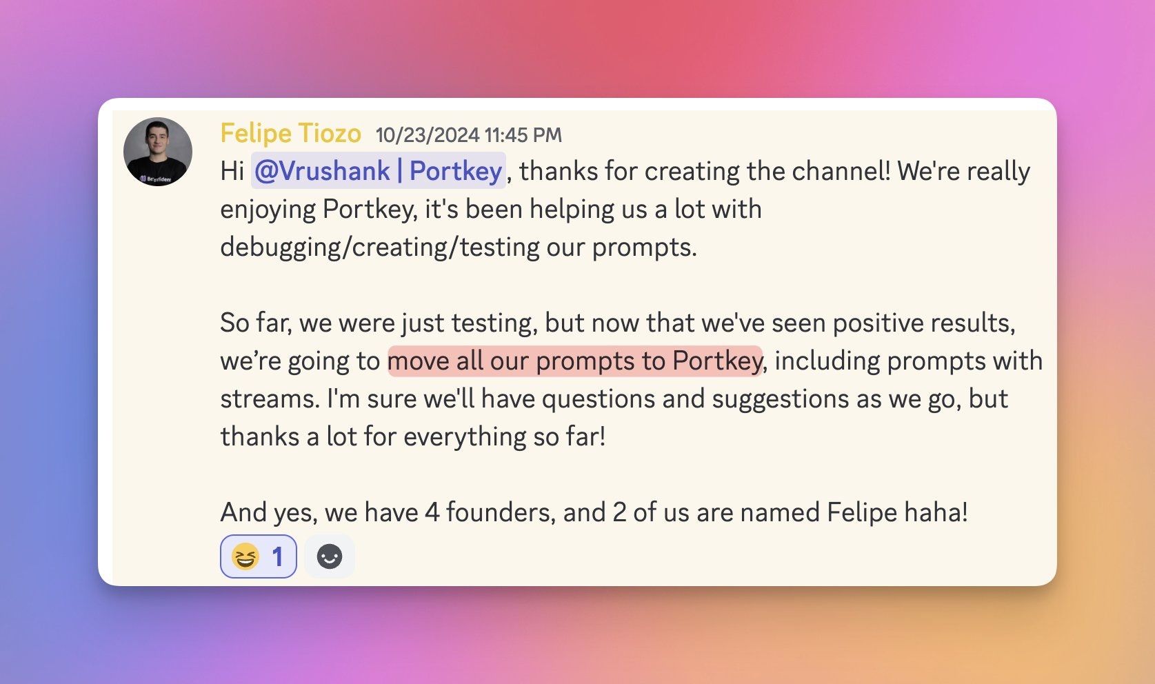 Felipe & team are building beconfident, and here’s what they had to say about Portkey:“Now that we’ve seen positive results, we’re going to move all our prompts to Portkey.”