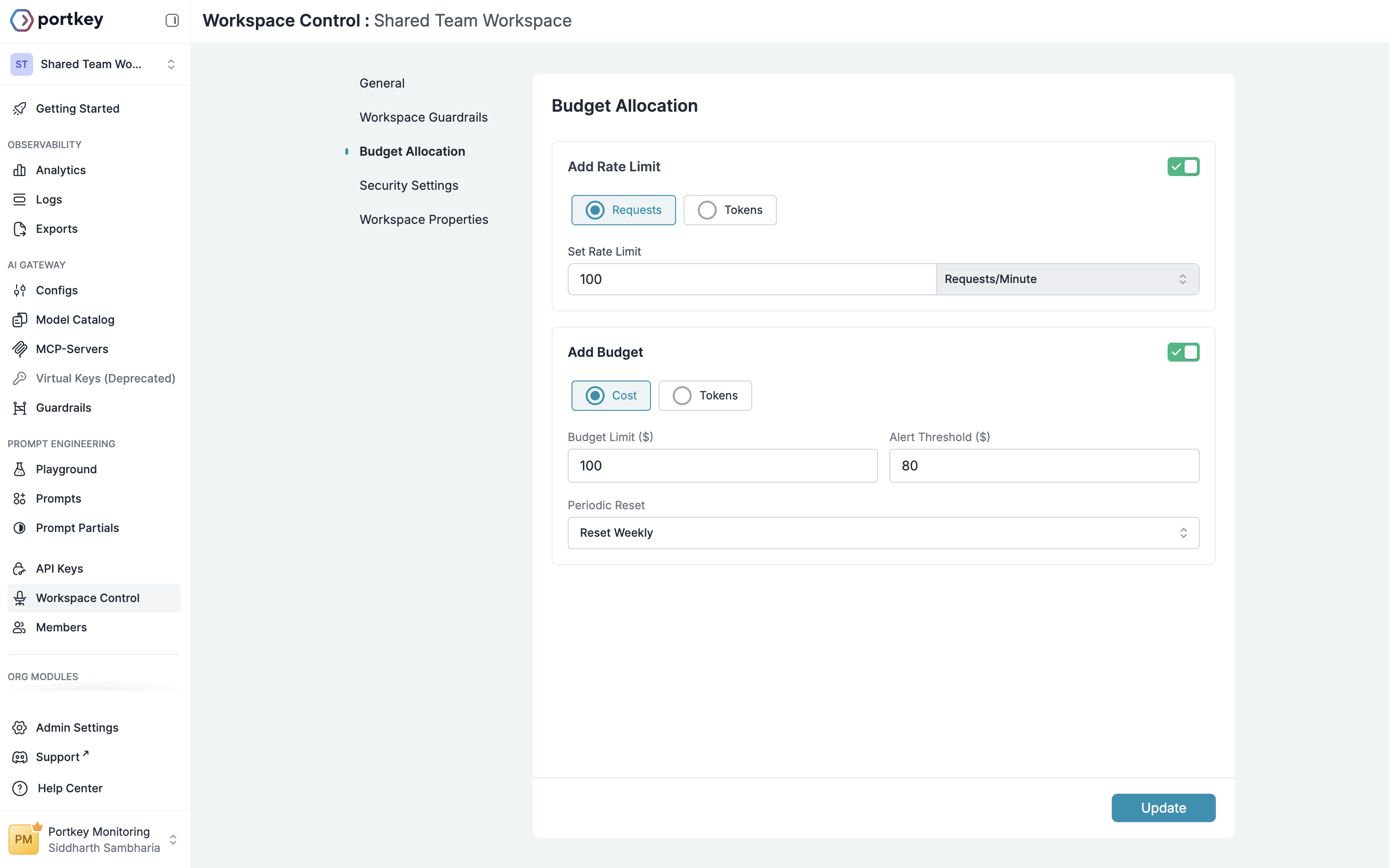 Set Workspace Budget and Rate Limits using Portkey Admin API
