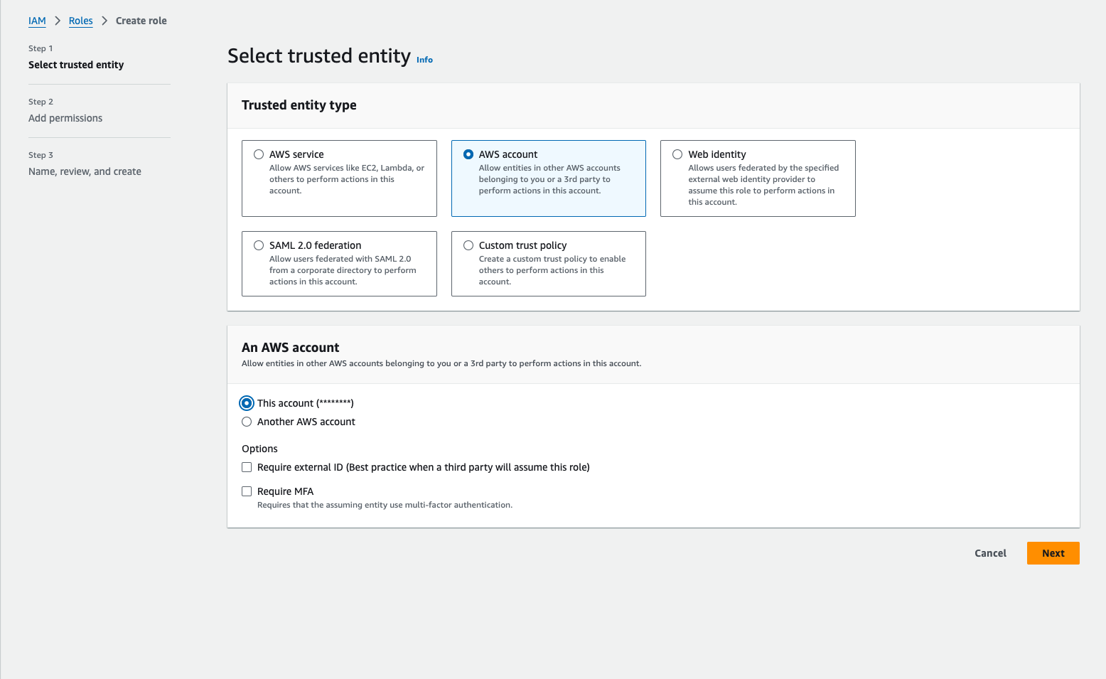 Choose AWS account as the trusted entity type. If you set an external ID be sure to copy it, we will need it later.