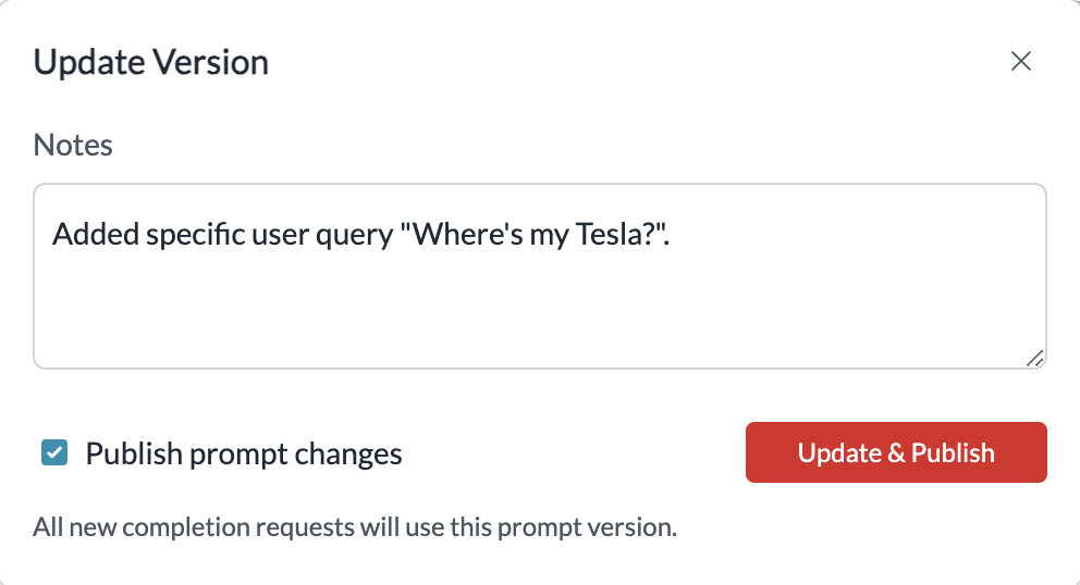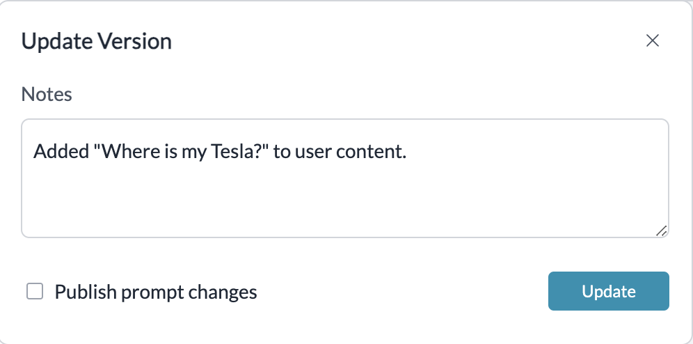 2. When ready for production, click “Update” and check “Publish prompt changes”