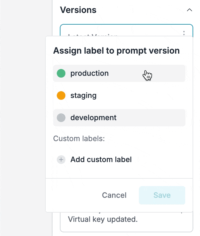 Labels make it easy for you to test prompt versions through different environments.