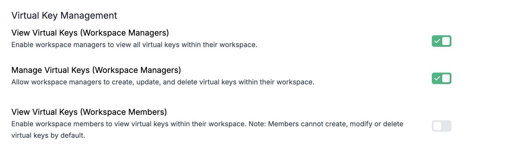 View Virtual Keys (Workspace Members)Enable workspace members to view virtual keys within their workspace. Note: Members cannot create, modify or delete virtual keys by default.